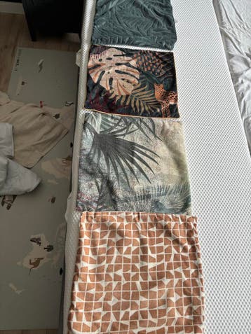 Vier kussenslopen met verschillende prints. Leuk voor bijvoorbeeld een junglekamer. Twee slopen hebben een jungleprint, één heeft een giraffe print en één is effen groen met bladmotief.