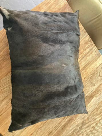 Prachtig kussen gemaakt van echte koeienhuid in een diepe donkerbruine kleur. Dit kussen voegt een vleugje natuurlijke elegantie en textuur toe aan elk interieur. Ideaal voor op de bank, een fauteuil