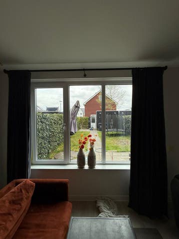 Gratis af te halen: complete set bestaande uit een zwarte gordijnroede en twee grijze verduisterende gordijnen. De buitenste verbindingstukken aan de muur zijn 260 cm uit elkaar en de totale breedte v