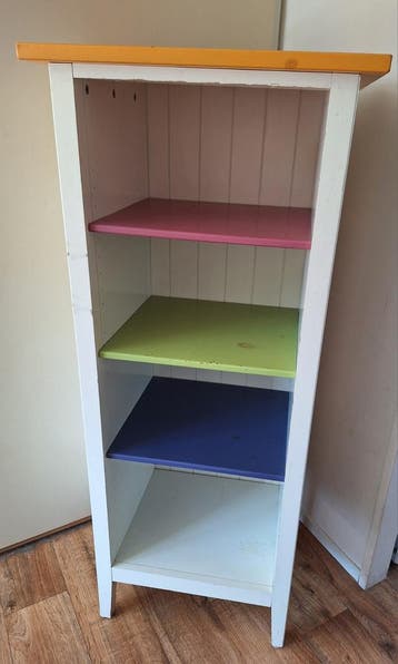 Nog een stevige boekenkast van visdalen. Met gebruikerssporen, een nieuw likje verf erop en de kast is weer als nieuw. Bovenblad 57 breed kast zelf 49 breed binnenmaat is 40 breed x 48 diep hoogte 1.3