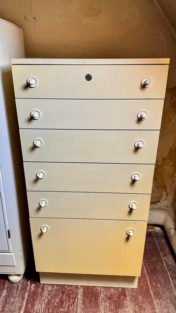 Deze ladekast heeft 5 laden en 1 kleplade. De afmetingen zijn 58cm breed, 126cm hoog en 38cm diep. Handig voor extra opbergruimte in bijvoorbeeld een berging of op zolder.