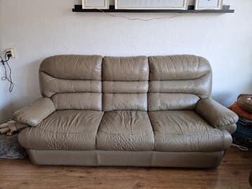 Gratis aangeboden: lederen beige 3-zitsbank 195cm (l) x 90cm (b) x 95cm (h) lederen beige 2-zitsbank met uitklapbaar voetensteun voetensteun ingeklapt: 160cm (l) x 85cm (b) x 95cm (h) voetensteun u