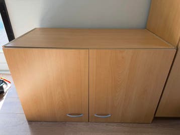 Dit is een bovenkastje met twee deuren. De afmetingen zijn 60 cm hoog, 50 cm diep en 97 cm breed. Er zit een plank in het midden. Op de plank zit een vlek, zoals te zien is op de foto.