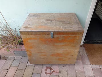 Handige grote kist, kan veel in. Denk aan oude dekens e.d.ongeveer 1 bij 1 bij 60 . Op wieltjes