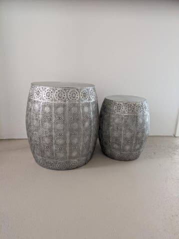 Twee zilverkleurige bijzettafels met een patroon. De tafels zijn verschillend van formaat. Ze kunnen gebruikt worden als bijzettafel of als plantentafel. Diameter 35 en 25 cm. Kijk ook eens bij mijn a