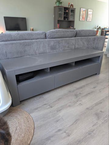 Stevig en ruim tv-meubel in antraciet kleur. We hebben zelf een nieuwe meubel. De buitenkant is zelf gelakt en je ziet wat vlekjes en kleine beschadigingen in de lak. Met een nieuwe verflaag kan hij w