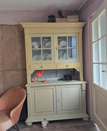 Deze buffetkast heeft een bovenkant met glazen deuren en een onderkant met dichte deuren. Er zijn ook twee lades aanwezig. De kast is licht van kleur.