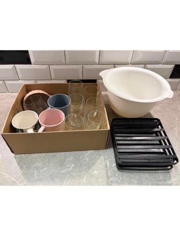 Diverse gratis keukenartikelen aangeboden, waaronder bekers, mokken, onderleggers en een mengkom. Ideaal voor starters of als extra in huis. Alles is gebruikt, maar nog in goede staat.