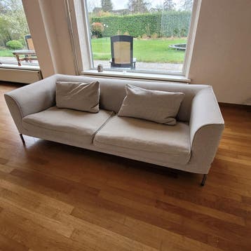 Een ruime tweezitsbank van montel. De bank is licht van kleur en heeft twee losse zitkussens en twee rugkussens. De poten zijn van metaal. Gratis af te halen. Kan voor 20 euro bezorgd worden in eindho