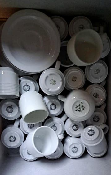 Een verzameling witte kopjes en een paar bordjes. De kopjes hebben verschillende logo's op de onderkant.