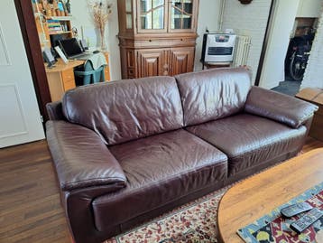 Lederen bank 3 persoons ivm verhuizing is deze bank overbodig geworden kleur bordeaux rood er heeft altijd een plaid op de zitting gelegen afmeting; 225x90 cm