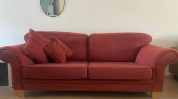 Deze rode bank is gebruikt. Het is een tweezitsbank met twee losse kussens. De bank heeft houten poten en is bekleed met stof.