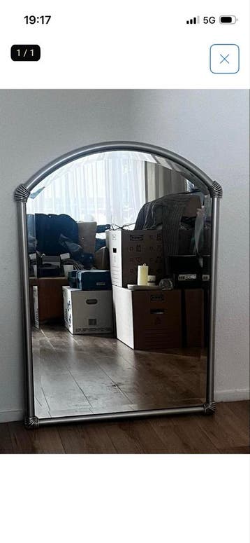 Mooie spiegel met een elegante boogvormige bovenkant en een stevig metalen frame. Deze spiegel is in goede staat en voegt een vleugje stijl toe aan elke kamer. Afmetingen: ongeveer 80 cm breed en 110