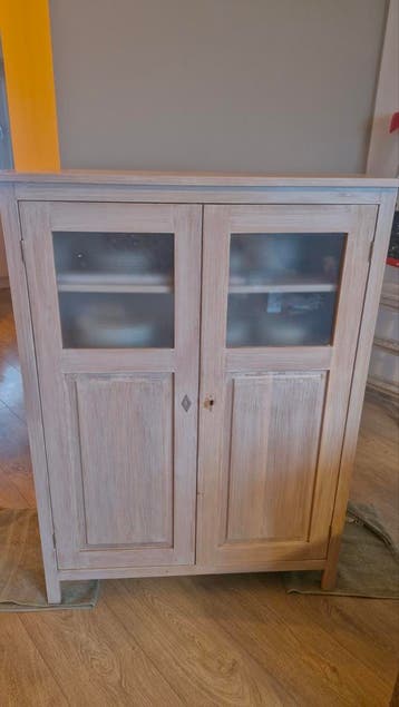 Kast met twee deuren, waarvan de bovenste helft van glas is. De kast heeft geen slot. De afmetingen zijn 103cm breed, 134cm hoog en 47cm diep. Er zitten planken in de kast.