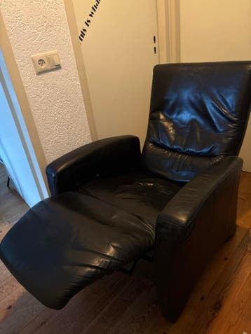 Een zwarte relaxfauteuil van leer. De fauteuil heeft een verstelbare voetensteun en rugleuning. Geen schade. Wel wat kleine gebruikssporen.
