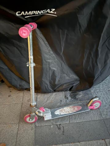 Een step met roze handvatten en wielen. De step is inklapbaar en heeft een standaard. Het deck heeft een antislip laag met een print. Hij heeft in de schuur gestaan