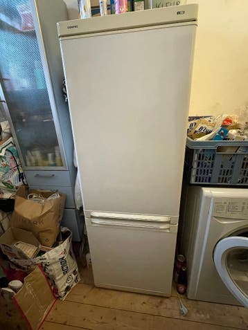 Fijne, ruime en hoge koelkast met 2 vriezer lades onderin. Werkt nog prima met af en toe een zucht. Het is een oudje. Van rond 2010 schat ik zo. Afmetingen: 155,7 cm hoog (vanaf de grond) 54 cm breed