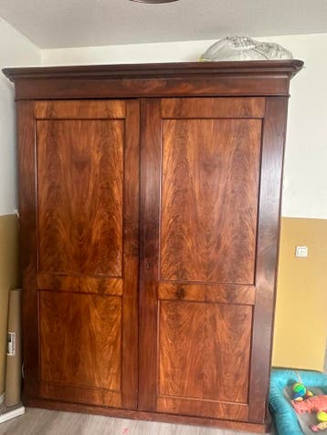 Antieke houten kledingkast – gratis mooie oude kledingkast van massief hout, stevig en nog in goede staat. Klassiek design en ook leuk voor decoratie. Kan uit elkaar gehaald worden voor makkelijk tran