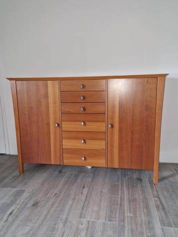 Mooi dressoir van 135cm breed, ideaal voor extra opbergruimte in de woonkamer, hal of slaapkamer. Het dressoir beschikt over meerdere lades en deuren, waardoor het zeer functioneel is. Het meubel is i
