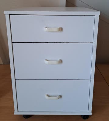 Wit nachtkastje / ladenkastje in nette en complete staat, voorzien van wieltjes. Afmetingen: hoogte: 60 cm (55 cm excl. Wieltjes) breedte 40 cm diepte: 42 cm mogelijk alleen nieuwe handvatjes plaatsen