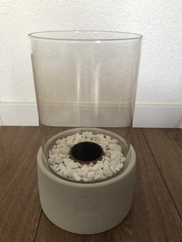 Deze tafelhaard van leeff, model ‘stonefire white’, is gebruikt maar ziet er nog prima uit. Er zit een fles bio-ethanol bij die ongeveer halfvol is. De haard is compleet met glas en witte steentjes. G