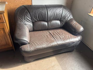 Twee leren banken, een tweezits en een driezits. Ze zijn gebruikt maar kunnen nog prima een ronde mee. Het leer is donkerbruin van kleur.