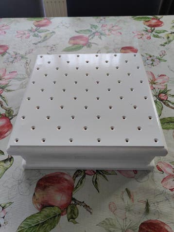 Deze handgemaakte cakepops standaard is wit van kleur en heeft meerdere gaten om cakepops in te plaatsen. De standaard is vierkant van vorm en is gemaakt van hout. Hij is te gebruiken voor het present