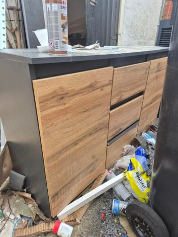 Kastje met 2 deurtjes en 3 laden. Heeft bij ons in de schuur gestaan (droog!), Maar mag nu weg, kan nog prima een ronde mee. Afmetingen: 121x35x75 gratis af te halen in hilversum
