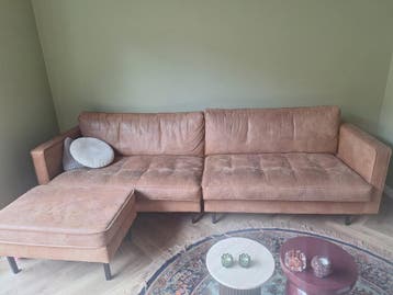 Mooie bruine bank van het merk bepurehome (model rodeo), bestaande uit twee delen en een losse poef. De bank is bekleed met stof en heeft een comfortabele zit. De poef is multifunctioneel en kan eenvo