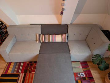 Deze bank is gratis af te halen. Het is een modulaire bank met verschillende grijstinten. De bank bestaat uit meerdere delen die je zelf kunt indelen. Er zit een losse poef bij die je als verlengstuk
