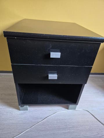 Gratis twee zwarte nachtkastjes met twee lades en een open vak. De kastjes hebben zilverkleurige handgrepen en pootjes. Ze zijn van hout. Ze zijn gebruikt en al een keertje overgeschilderd maar altijd
