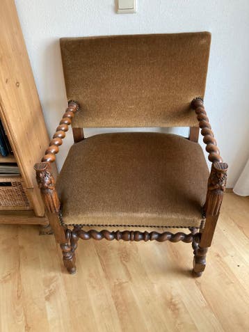 Prachtige, stevige klassieke stoel met rechte zit en aparte beeldjes bij de armleuningen. Waarschijnlijk eikenhout. Breedte ca. 64 Cm, hoogte ca. 91 Cm, diep ca. 50 Cm, zithoogte ca. 48/50 Cm.