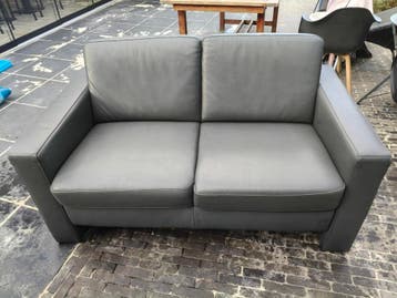 Twee tweezits banken van grijs leer. Er zijn gebruikerssporen zichtbaar, maar met een plaid eroverheen kunnen ze nog heel fijn een ronde mee. De banken hebben een comfortabele zit en er zit een verpla