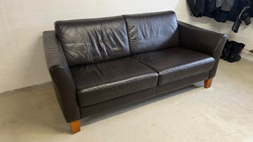 Donkerbruine leren bank met twee zitplaatsen. De bank heeft houten poten en is gemaakt van leer. Er zijn wat gebruikssporen zichtbaar op het leer maar verder is de bank erg netjes. Gratis af te halen