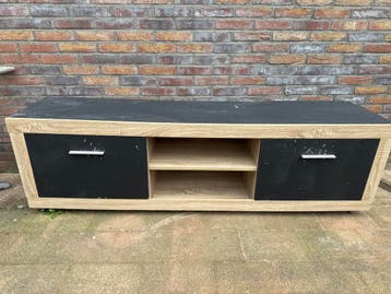 Dit moderne tv meubel is ideaal voor elke woonkamer. Het meubel heeft een stijlvolle combinatie van houtkleur en zwart, en biedt voldoende opbergruimte voor al uw media-apparatuur en accessoires. Met