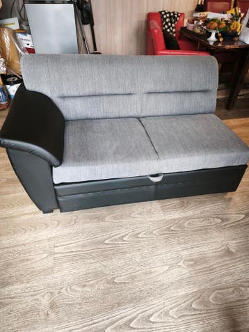 Deze slaapbank is zo goed als nieuw en is weinig gebruikt. Het is een slaapbank zonder hoekstuk, uitgevoerd in grijs met zwarte accenten. De bank is uitschuifbaar tot een slaapplek.