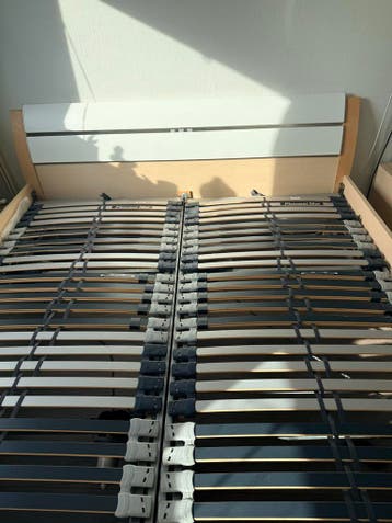 Dit is een tweepersoonsbed met een licht houten frame en een wit hoofdbord. Het bed heeft twee lattenbodems van 2x 90 2.00 , Zoals te zien op de foto's. De lattenbodems zijn van het merk 'fles