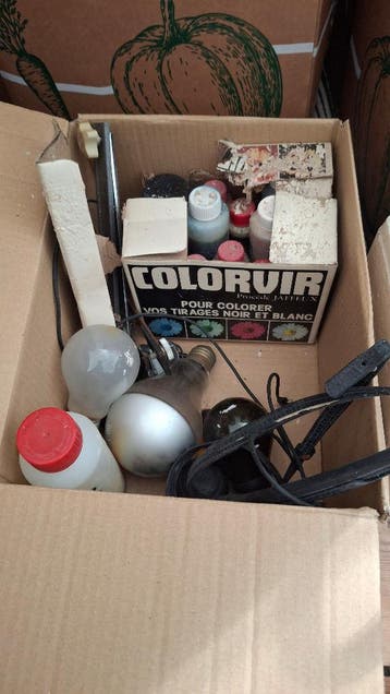 Gratis op te halen: materiaal voor gebruik in een donkere kamer, oftewel om oude foto's te ontwikkelen. O.a. Kleurstoffen, chemische ontwikkelaar, gereedschap en lampen. Er is meer dan wat op de f