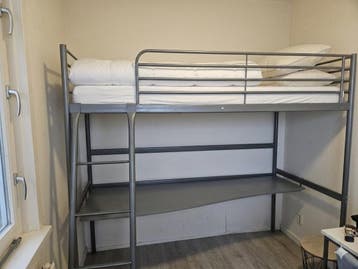 Stoere hoogslaper met groot bureau. Weinig gebruikt. Moet z.s.m. Weg. Gratis meenemen zelf demonteren lift aanwezig.