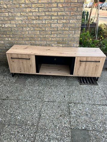 Dit is een tv-meubel met een houtlook. Het meubel heeft twee deuren met zwarte handgrepen en een open vak in het midden. Er zit een gat in de achterwand van het open vak voor kabels. Het meubel staat