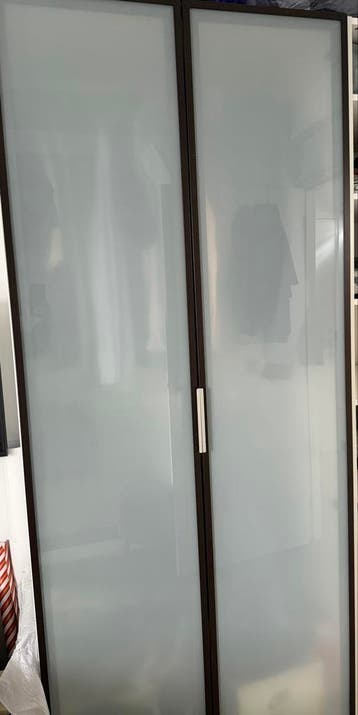 ❗️alleen deuren geen scharnieren ❗️ twee deuren voor een ikea pax kast. De deuren zijn 229 cm hoog. Ze hebben een donkerbruine rand en matglazen panelen.