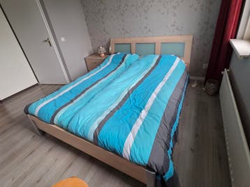 Dit is een 2-persoons ledikant met twee nachtkastjes en een lattenbodem. Het ledikant is 220 cm lang en 170 cm breed, het hoofdeinde is 177 cm breed. De nachtkastjes zijn 65 cm breed en 35 cm diep. He