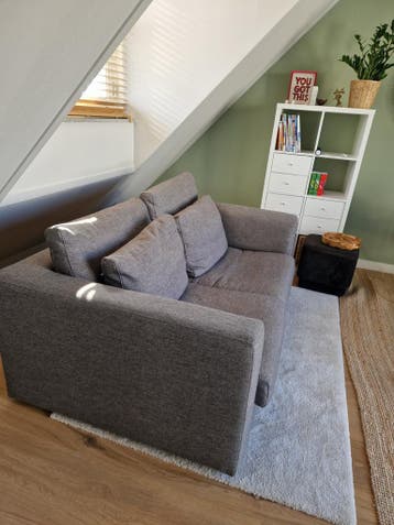 Gratis af te halen, donkergrijze goossens bank. Maten 120 cm diep, 184 cm breed, 70 cm hoog en met de kussens 90 cm hoog.