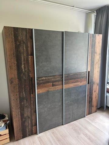 Kledingkast met 2 gelijke hanggedeelten en planken. In het middenstuk schuifdeuren voor de hanggedeelten. 3,5 Jaar geleden gekocht bij woonenzo, nog een mooie kast. Hij kan niet mee met verhuizen, daa