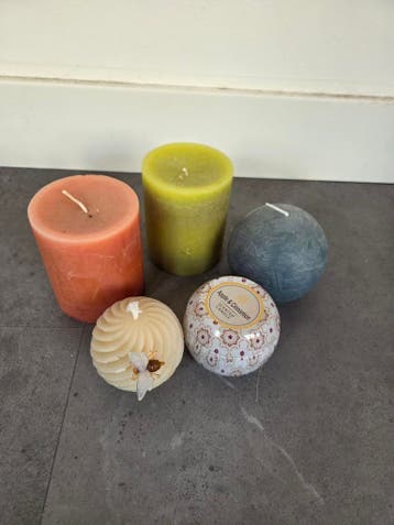 Een verzameling van diverse kaarsen, waaronder stompkaarsen en een geurkaars, gratis af te halen. Ideaal om sfeer in huis te brengen of als decoratie. De kaarsen zijn in gebruikte staat, maar kunnen z