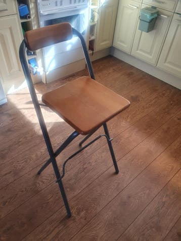Gratis af te halen in almere stad 3 stuks opklapbare barkrukken met rug leuning gemaakt van combinatie metaal en hout hoogte 110cm breedte 042cm gebruikt als zitplaats op rommelmarkten reserveren doen