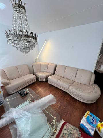 Mooi en comfortabel 3-delig leren bankstel in een lichte, neutrale kleur. De set bestaat uit een tweezitsbank, een driezitsbank en een hoekelement, waardoor diverse opstellingen mogelijk zijn. Ideaal