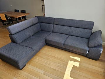 Hoekbank met verstelbare hoofdsteunen en zij arm. Er zijn enkele verkleuringen door zonlicht en het zitgedeelte in de hoek is lichtelijk doorgezakt. De bank bestaat uit twee delen. Afmetingen (+/-): 2