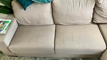 Deze comfortabele hoekbank is op zoek naar een nieuw thuis. De bank is gebruikt, met wat verkleuring, vlekjes en een ingezakt kussen.
