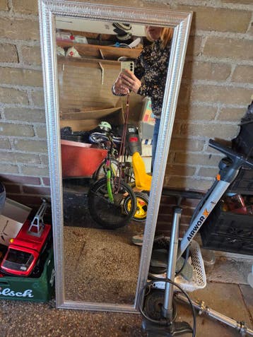 Deze zilverkleurige spiegel heeft een rechthoekige vorm. De lijst heeft een licht patroon.